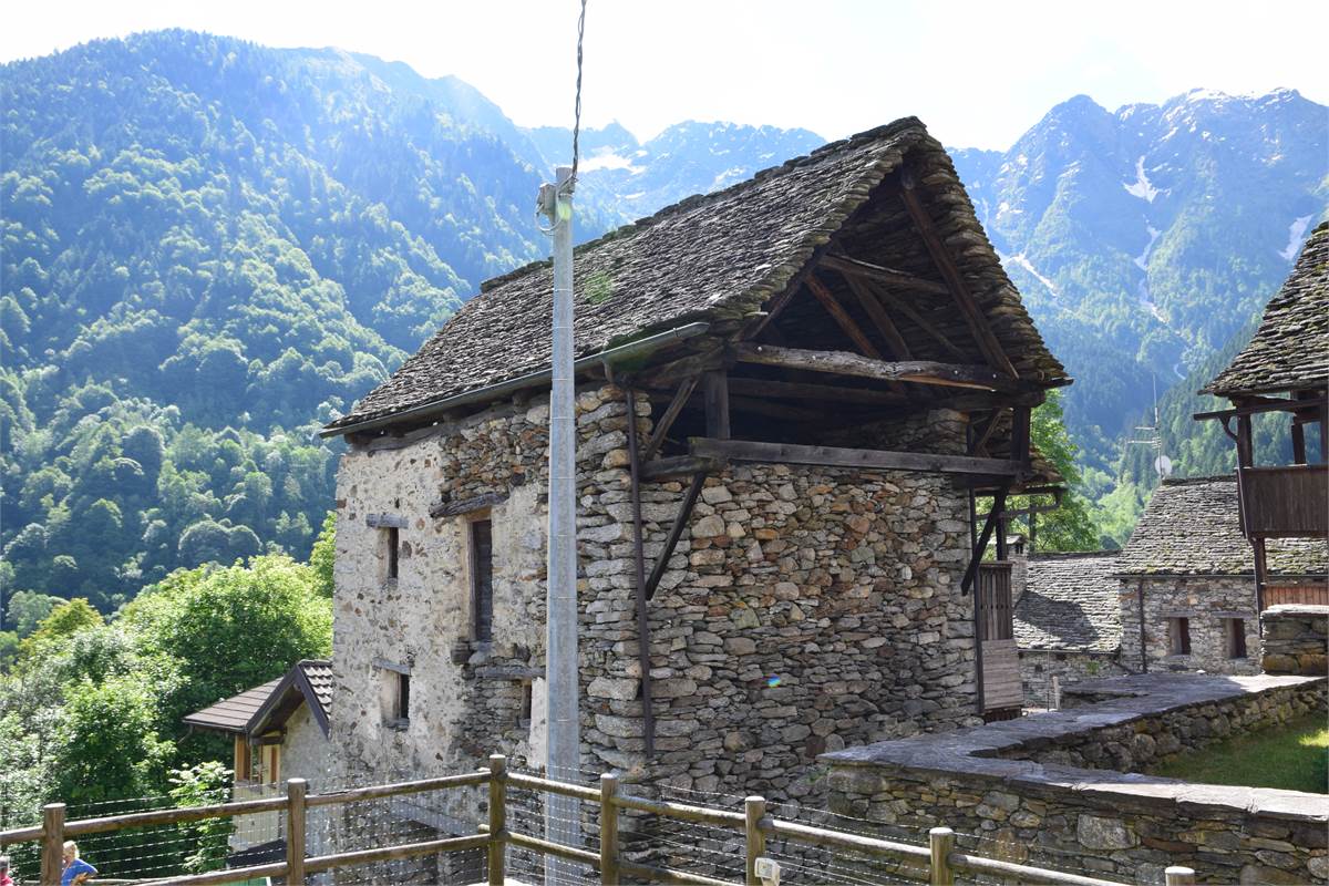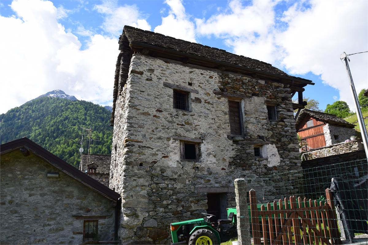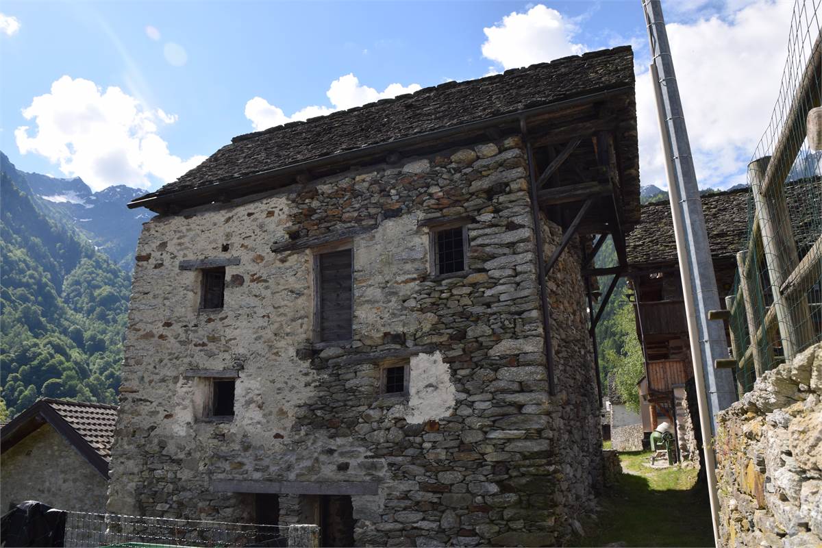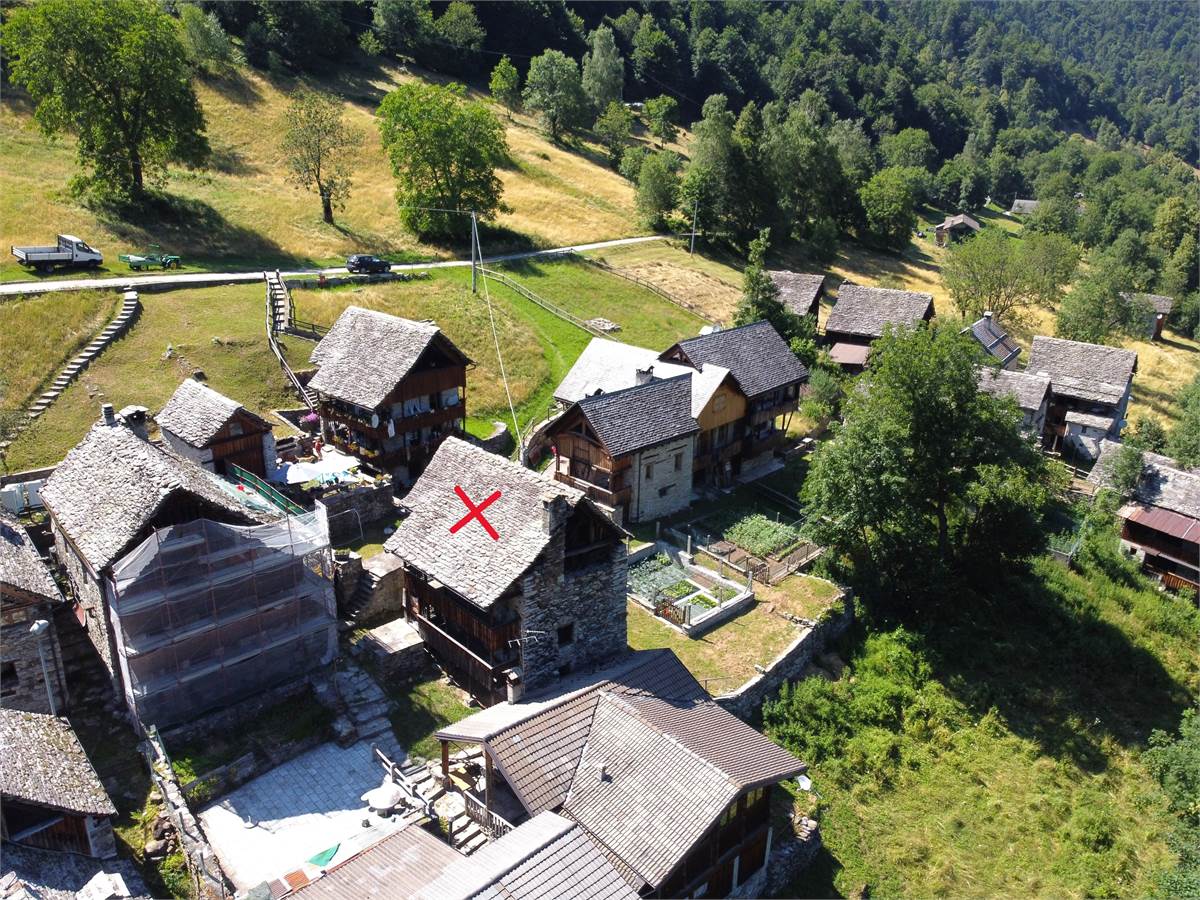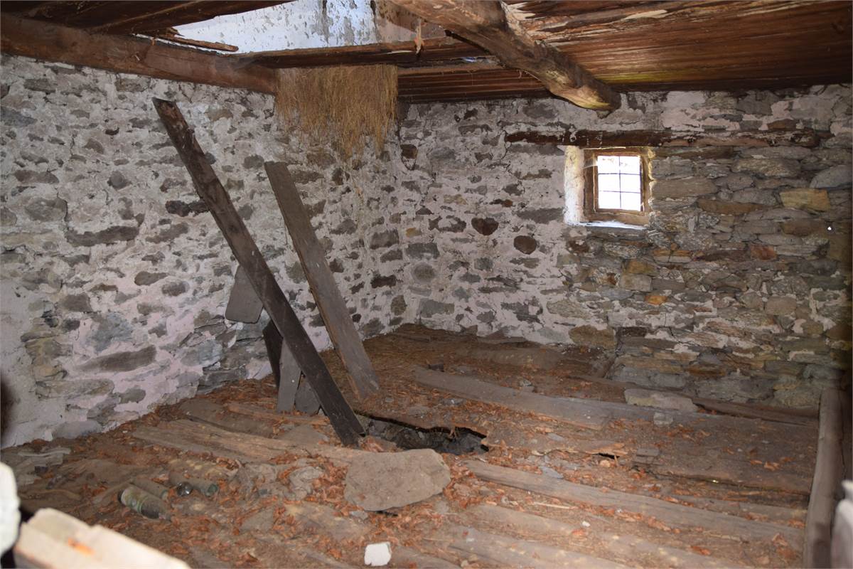 La copertura, con il caratteristico manto in piode tradizionali su orditura portante in tondi di legno, è stata completamente rifatta nel 1988 compresa di camino e canaleria in rame. In tale occasione, sono stati rifatte anche le due balconate in legno massiccio al piano rialzato e al primo piano che corrono lungo tutto la facciata prospicente la piazzetta. Successiva manutenzione straordinaria al tetto nel 2020. Effettuato sopralluogo a fine Giugno 2025 con impresario che garantisce le buone condizioni della copertura con solo qualche piccolo intervento di manutenzione necessario, costo stimato di poche migliaia di euro. Immobile privo di impianti (possibilità di allaccio all'energia elettrica e all'acquedotto nelle immediate vicinanze). Presente antico fornetto con carica dall'esterno, sul balcone. A completamento della proprietà vi sono: