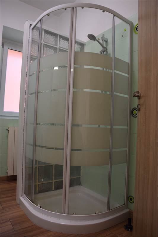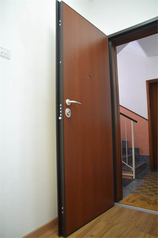 The property measures approximately 80 square metres (excluding external walls) and comprises an entrance hall with security door, living room, kitchen, two bedrooms, one with a small stone balcony, hallway and bathroom with shower. The property also includes a private cellar in the basement and a portion of the attic, not enclosed by walls.