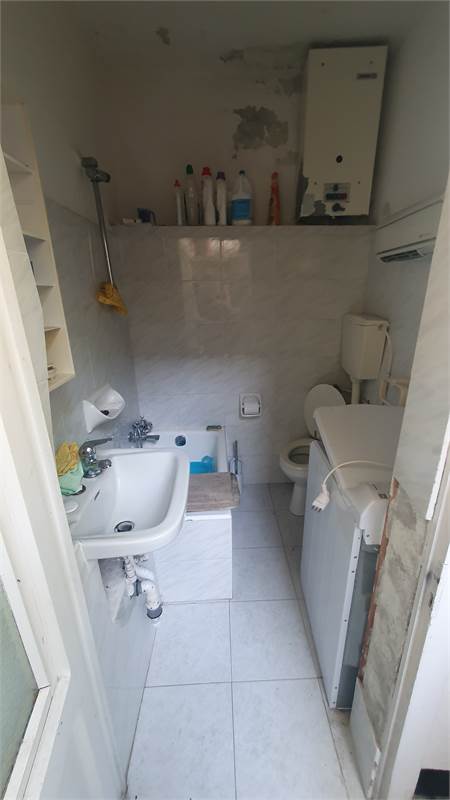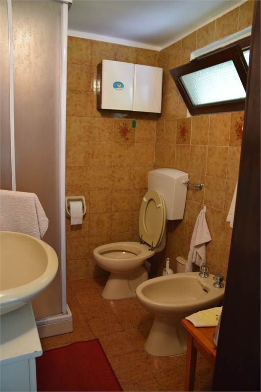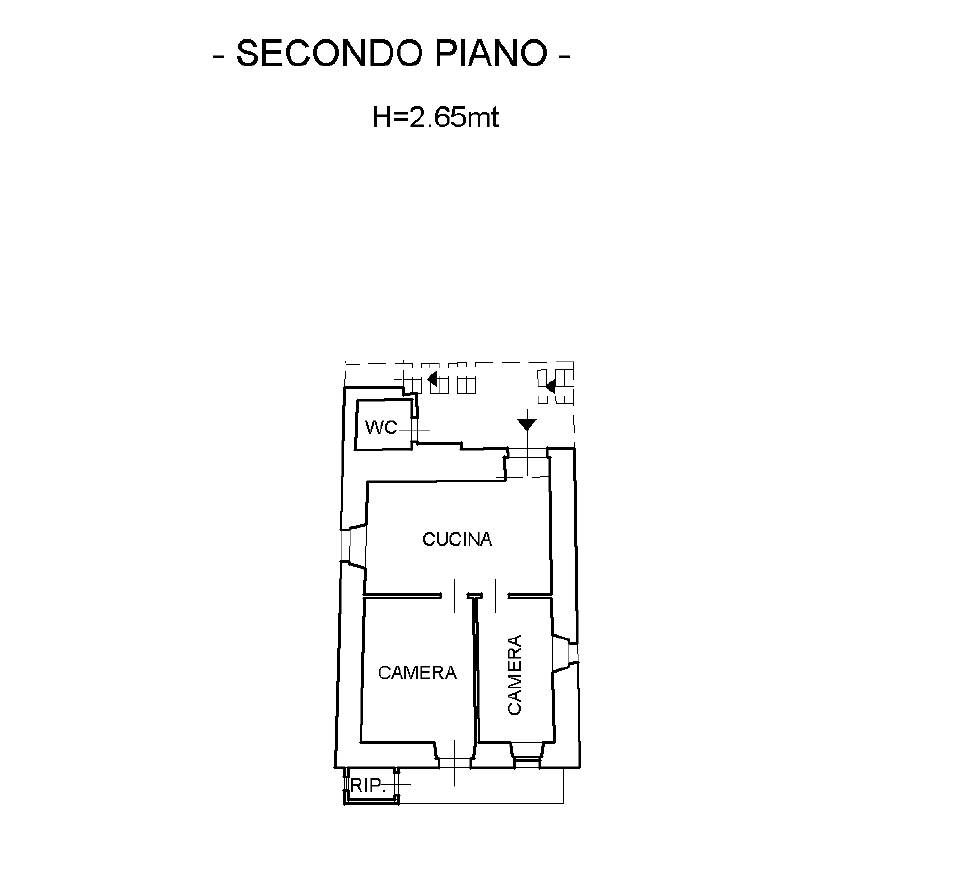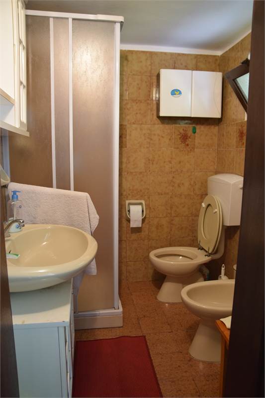 • L'appartamento al secondo piano misura circa 60 mq commerciali ed è composto da ingresso su zona giorno con angolo cottura e stufa a legna, camera da letto matrimoniale, camera da letto singola e balcone a sud con ex bagno esterno, oggi ad uso ripostiglio. Il "nuovo" bagno si trova appena di fianco la porta d'ingresso ed è con vasca.